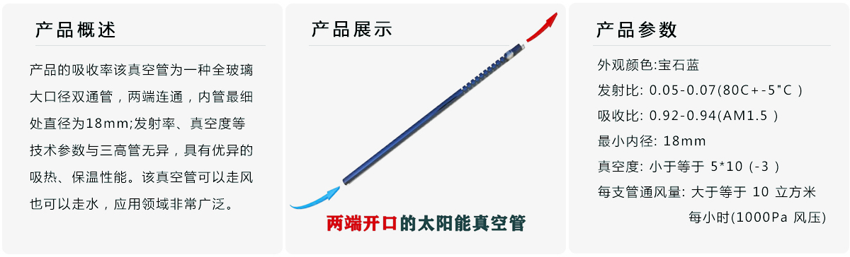 玻璃太陽能雙通管是兩端開口的太陽能真空管。該產(chǎn)品的出現(xiàn)顛覆了很多領(lǐng)域太陽能的應(yīng)用模式,通過該產(chǎn)品可很容